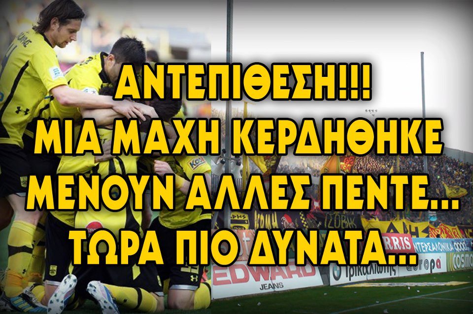 Επομενη μαχη στα Γιαννενα,και θα ειμαστε ολοι εκει στο πλευρο του Θεου, μια ακομη μαχη, μια ακομη νικη,γιατι ΑΡΗ μου δεν γινετε αλλιως, οι ιαχες του πολεμου,εχουν σαλπισει και εμεις πιστοι στο καλεσμα τους, παμε να γεμισουμε το παγουρι μας με ενα τριποντο,και να γινουμε πασαδες στα Γιαννενα.